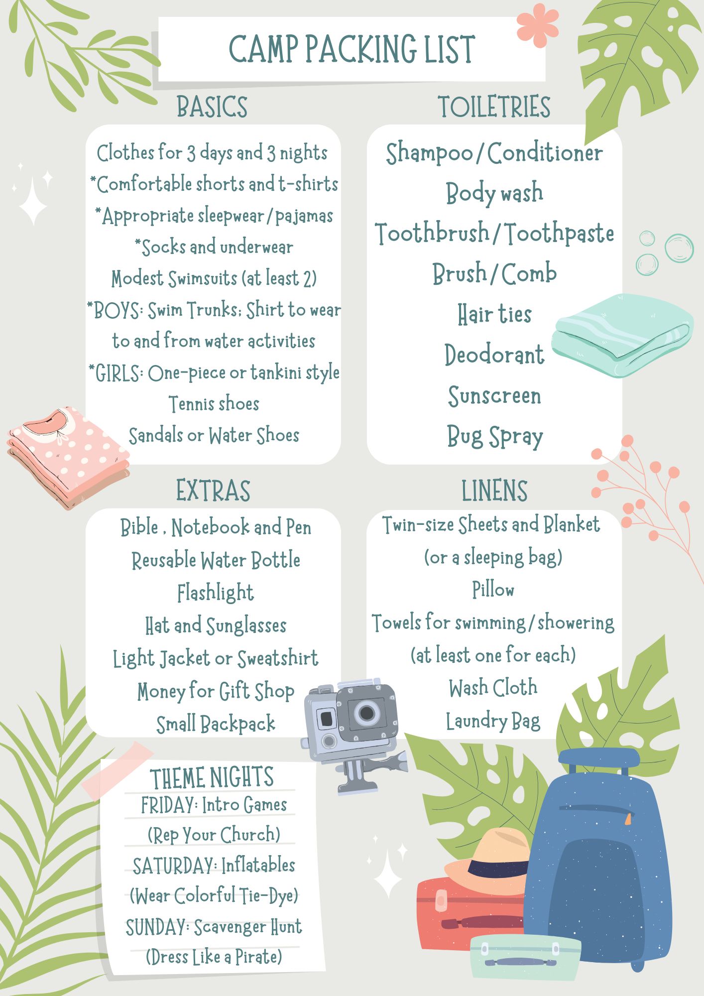 - THEME NIGHTS! Bring the follow fun attire to wear on one of our theme nights! (Info coming soon!)